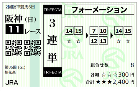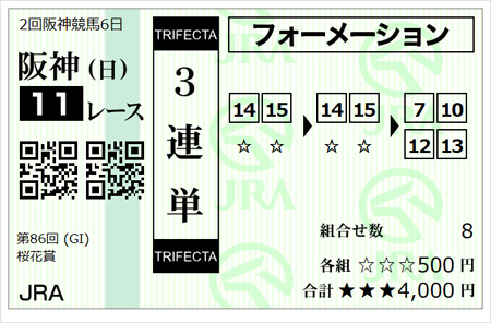 相手だけを広くし、堅いとこで7番アランカールと13番アランジョワ、穴目で10番ナムラコスモスと12番スウィートハピネスを選んで組むだけにします。